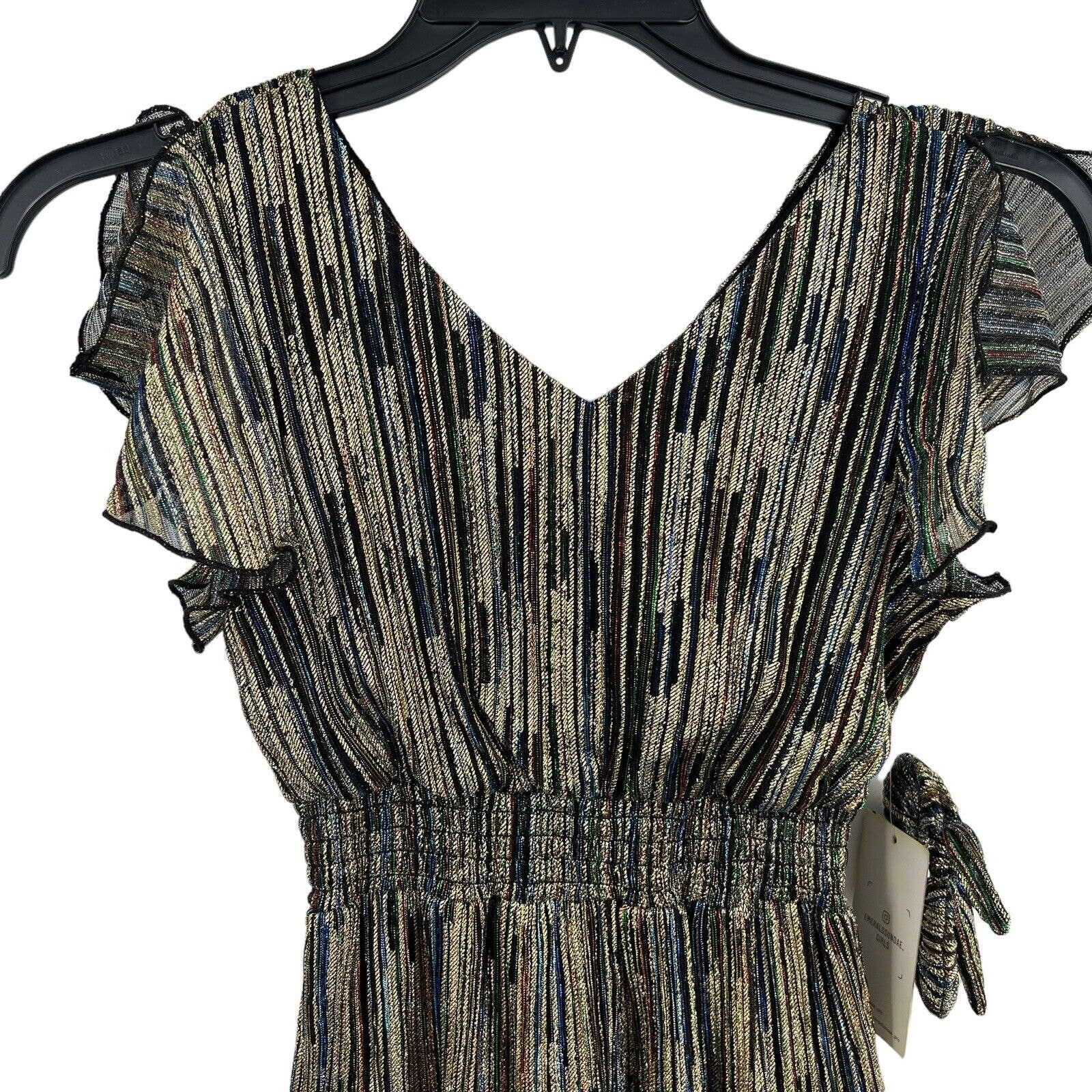 Emerald Sundae multi-color metallic dress. Tiered flowing skirt with an elastic waist and tie-back. Split flutter sleeve and V-shape neckline.